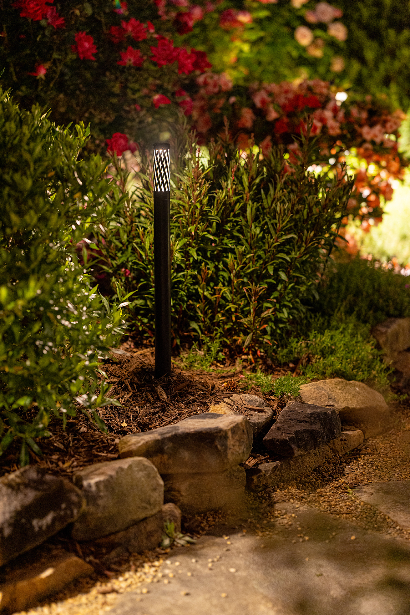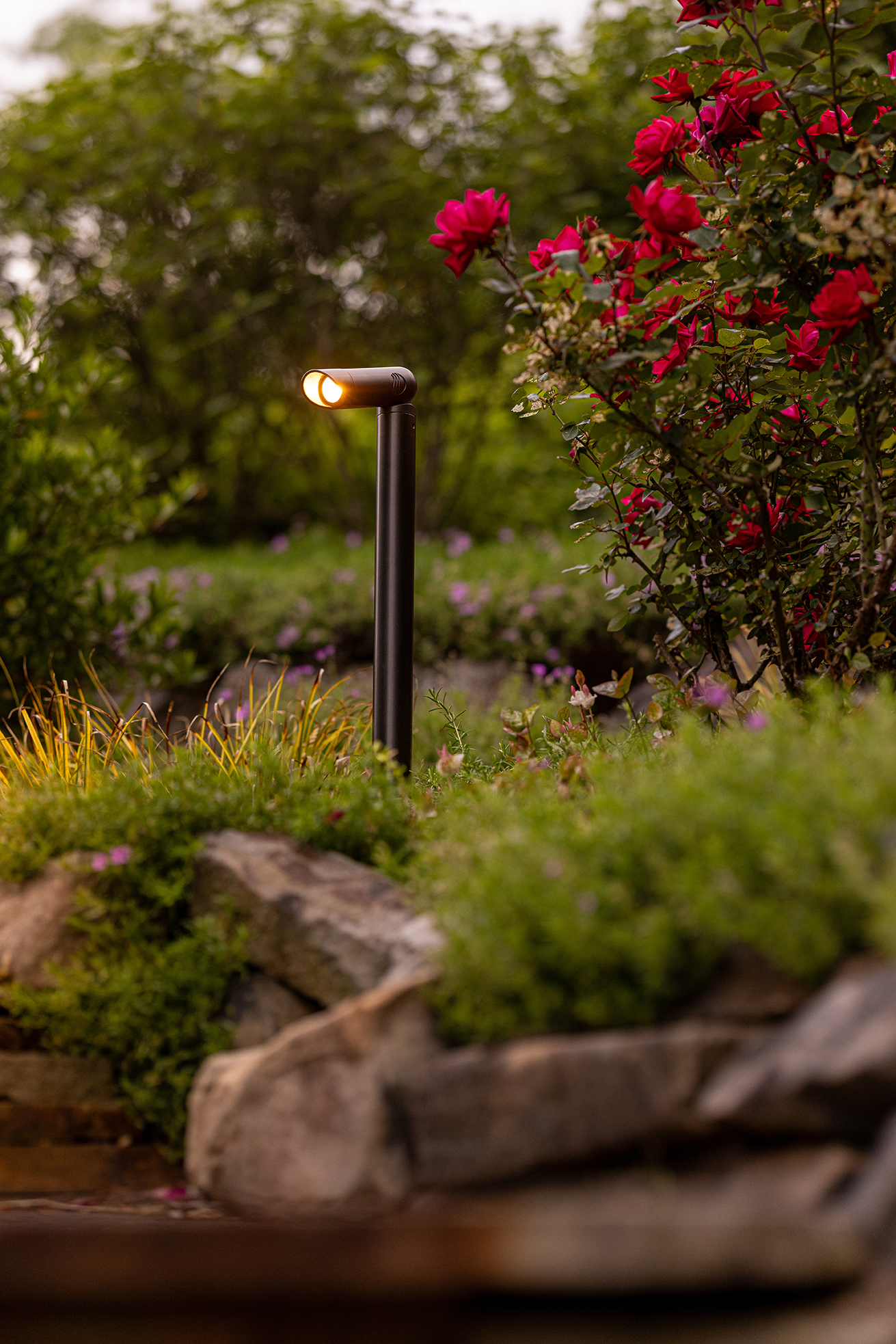 For Heather, an avid gardener, the lighting design has transformed her garden into a nighttime gallery of color and texture. “Our goal was to bring her garden to life after sunset not with harsh lighting, but with the softness of moonlight,” Sepesi explained. “The wide-throw path lights celebrate the roses and flowering ground cover while ensuring each step on the irregular stone walkway feels comfortable.”