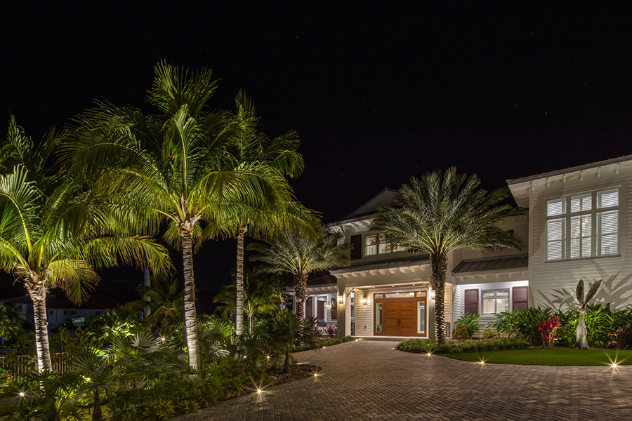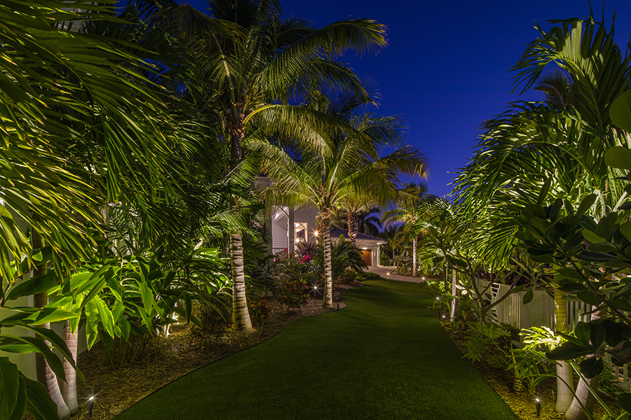 In addition to functional lighting, D’Asign Source also incorporated artistic accents. Outdoor sculptures were carefully highlighted with accent lighting, adding a personalized touch to the landscape. D’Asign Source’s thoughtful selection of plantings included coconut palms, Frangipani, Keys Lily, Lipstick Palms, ginger, bamboo, and Silver Date Palms, further enhance the tropical paradise aesthetic.